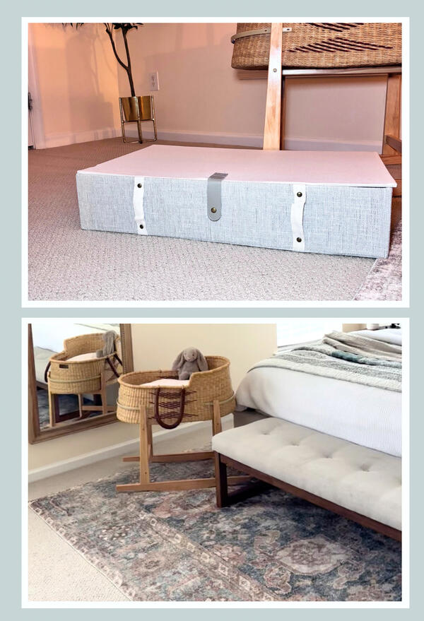 Currently, our ideal "plan" is to keep the baby in our room for 2-3 months at our bedside in a bassinet and hopefully have a new home with a space for her to sleep when it's time to transition to a crib!As I've started to accumulate all of the newborn clothes and swaddles, I cleared a drawer in my room to dedicate to these items. I also picked up a closed storage bin to keep more relevant clothes in for the newborn stage since they tend to run through so many sleepers, onesies and swaddles within those first few weeks. It's a flat bin that could easily slide under a bed and tuck away when not being used.We have a corner of our bed room that will be a dedicated space for the bassinet and clothing bin and a backup plan for sharing space with big sister, Lucy, incase we aren't on the move when it's time to transition to a crib!The hardest part of all of this is fighting the urge to nest when there's not much space to nest in! Being in this limbo phase is just another part of life where we have to be adaptable, and I have a feeling we will truly cherish some of our last core memories we create in our first home together when we become a family of 5.